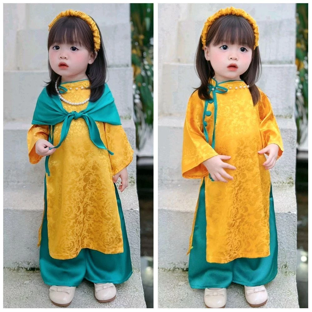 Áo dài Tết Gấm cổ kiểu lệch đính ngọc cho bé